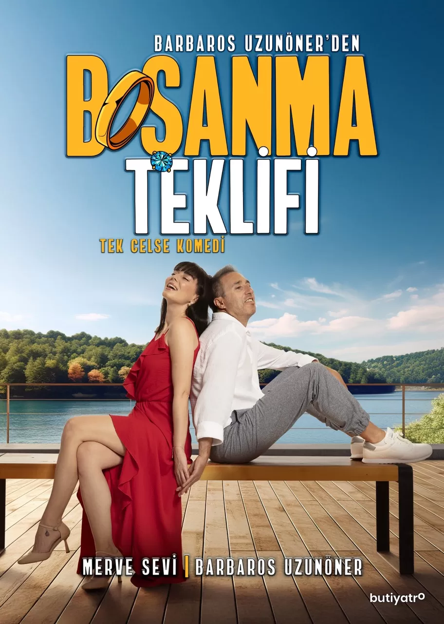 Ünlü oyuncular Merve Sevi ve Barbaros Uzunöner, izleyiciyi kahkahaya boğacak yeni bir komedi ile sahneye çıkıyor: “Boşanma Teklifi”.