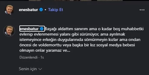 Başak Karahan’ın açtığı dava, Enes Batur’un sosyal medyada yaptığı bir paylaşım üzerine başladı. Batur paylaşımında, “Başak’ı aldattım sanırım ama o kadar boş muhabbet ki evlenip evlenmemesi yalanı gibi sürünüyor. Ama ayrılmak istemeyince erkeğin duygularını da sömürmeyin kızlar. Ama ondan öncesi de Voldemort’tu veya başka bir kız sosyal medya bebesi olmayın onlar yaramaz ve…” ifadelerini kullandı.